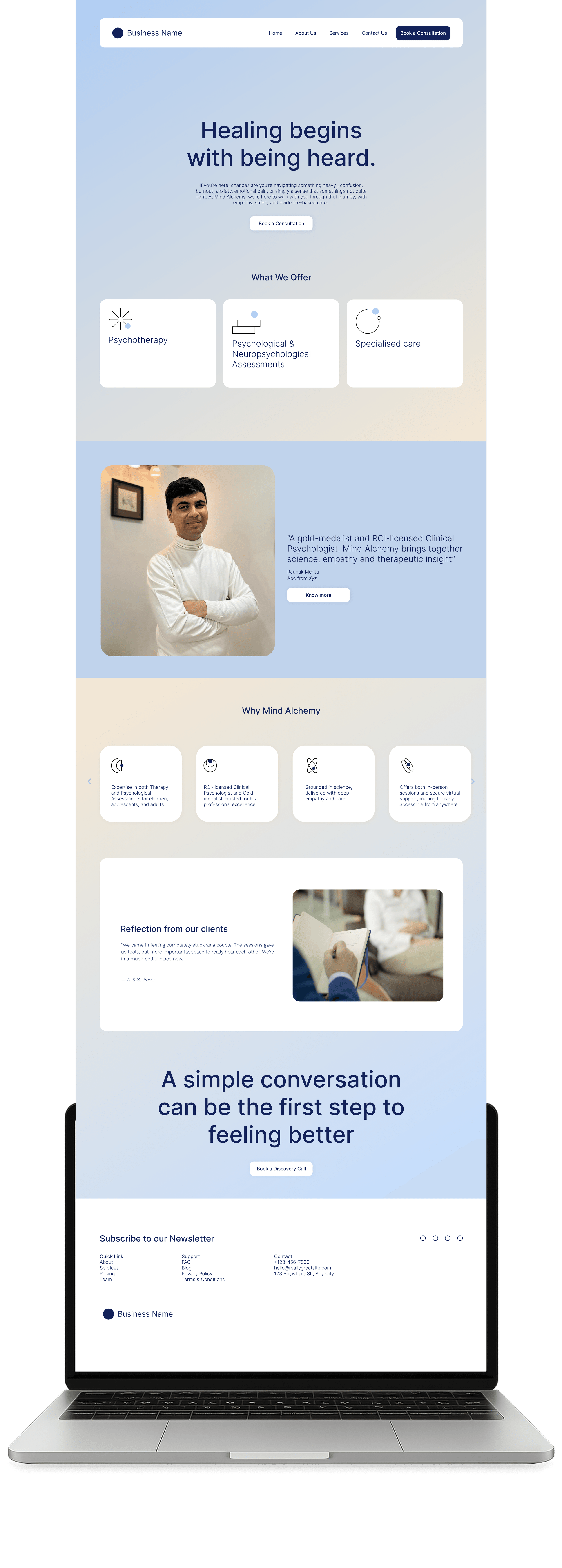 • Web Design & Development: Created a clean, intuitive, and calming website that reflects the safe space Mind Alchemy offers.